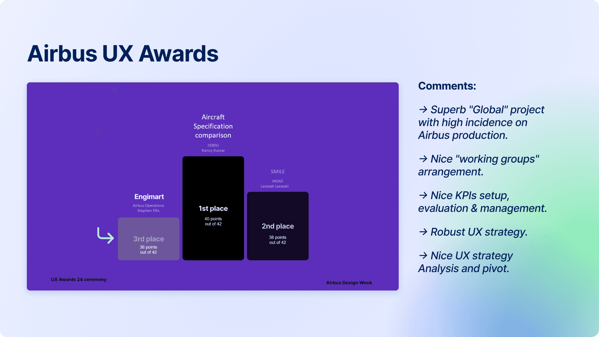 We are proud to have received the 3rd place in the Airbus UX Awards during the Design week in 2024, recognizing our efforts in creating a user-centered solution for engineering teams. This achievement highlights the impact of our design approach, and motivates us to continue refining the platform as we prepare for its official launch in 2025.